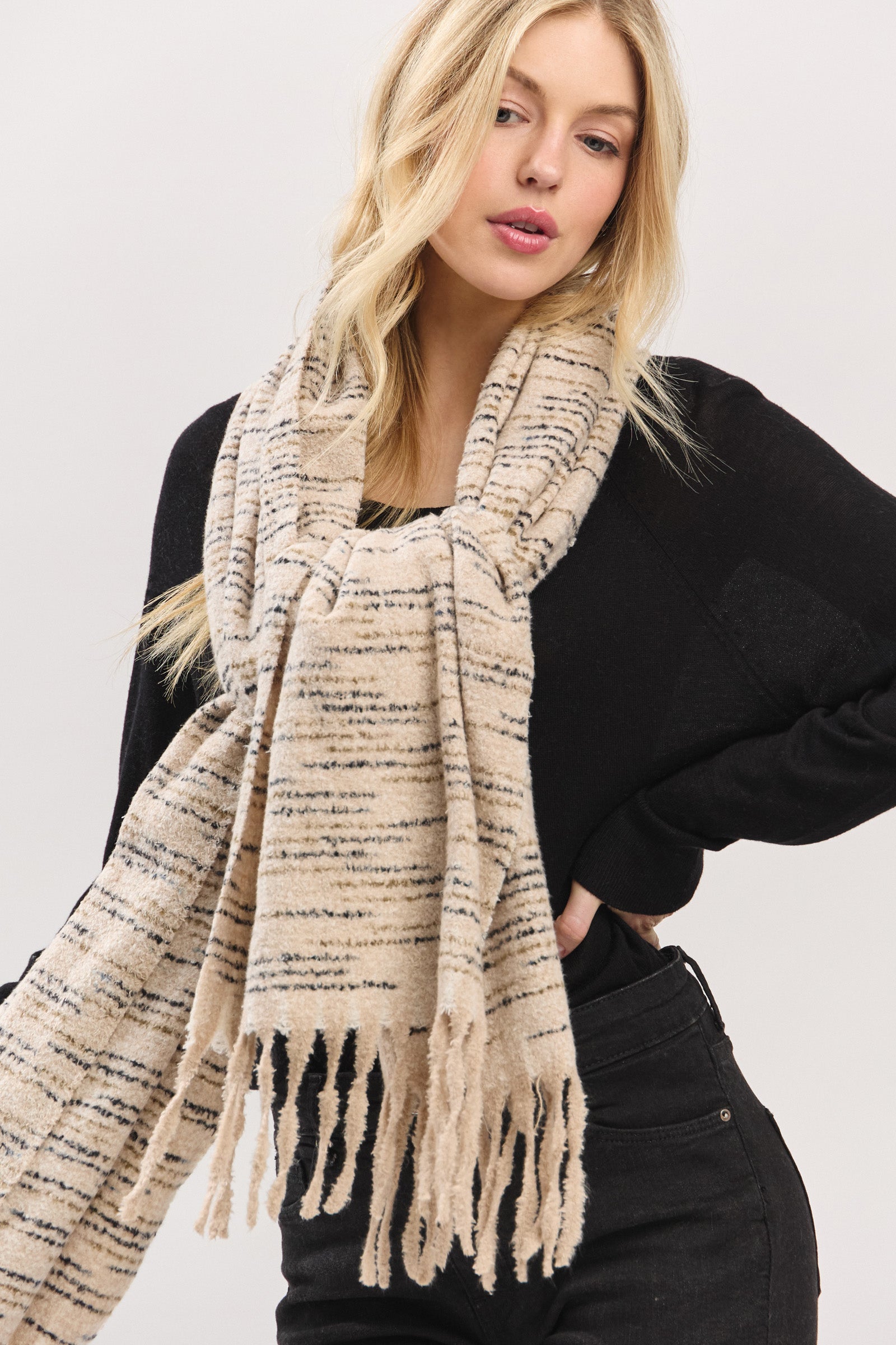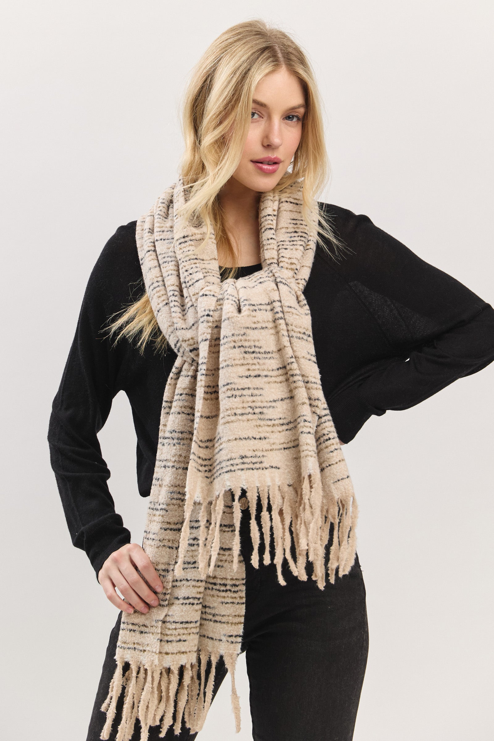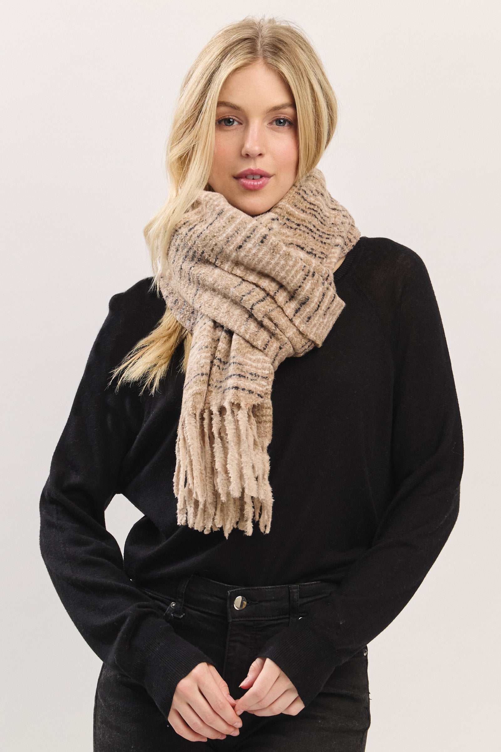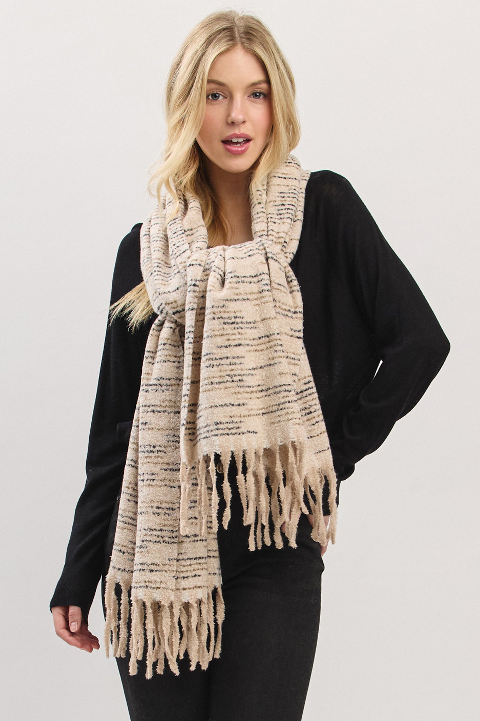 Wrap yourself in cloud-like comfort with this ultra-soft textured scarf. Designed with a plush, touchable knit and finished with playful fringe edges, it offers the perfect blend of warmth and style. Lightweight yet cozy, this scarf effortlessly drapes for a relaxed, laid-back look—ideal for chilly days or elevating everyday outfits with ease. A versatile must-have for the season.