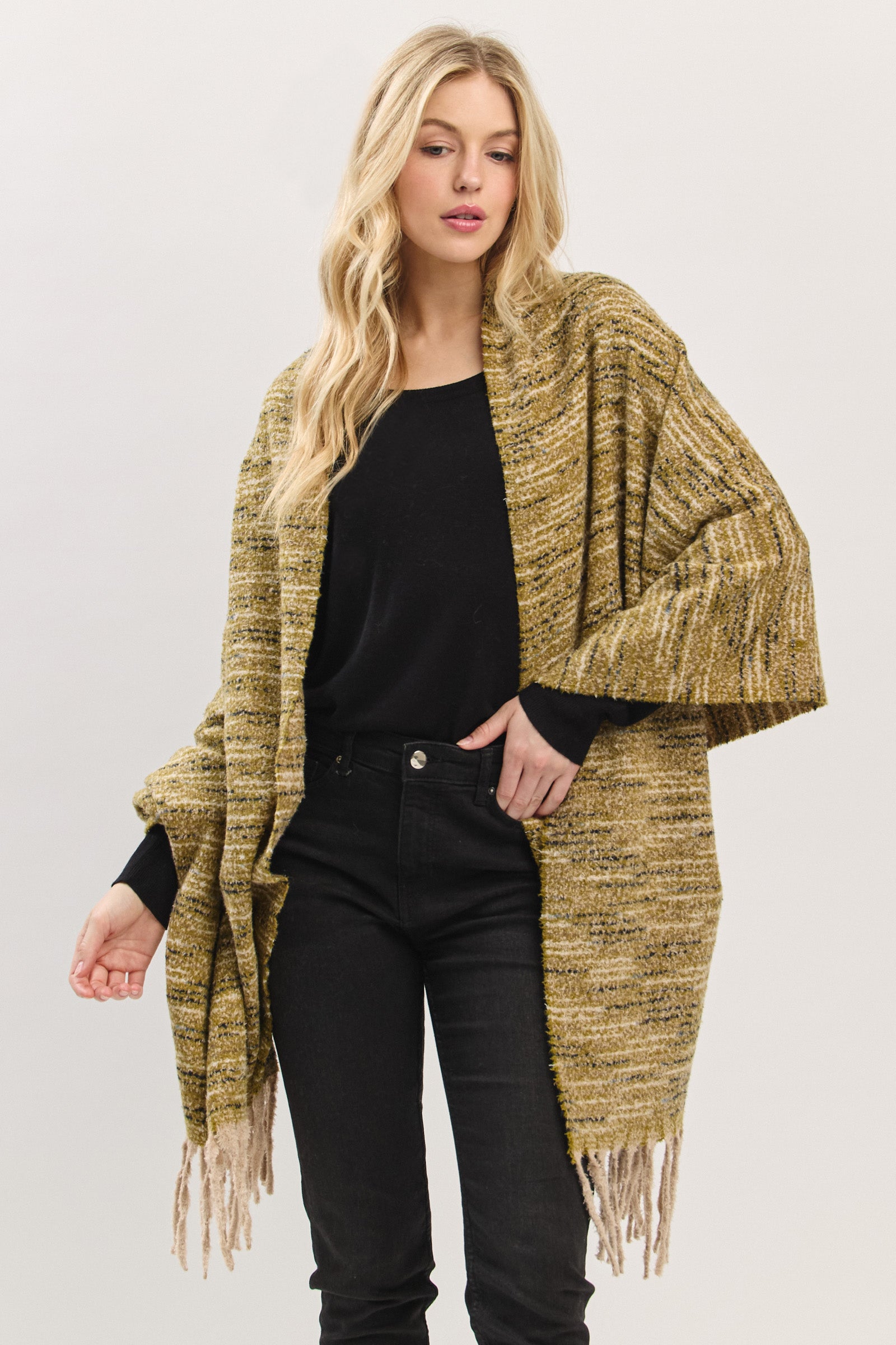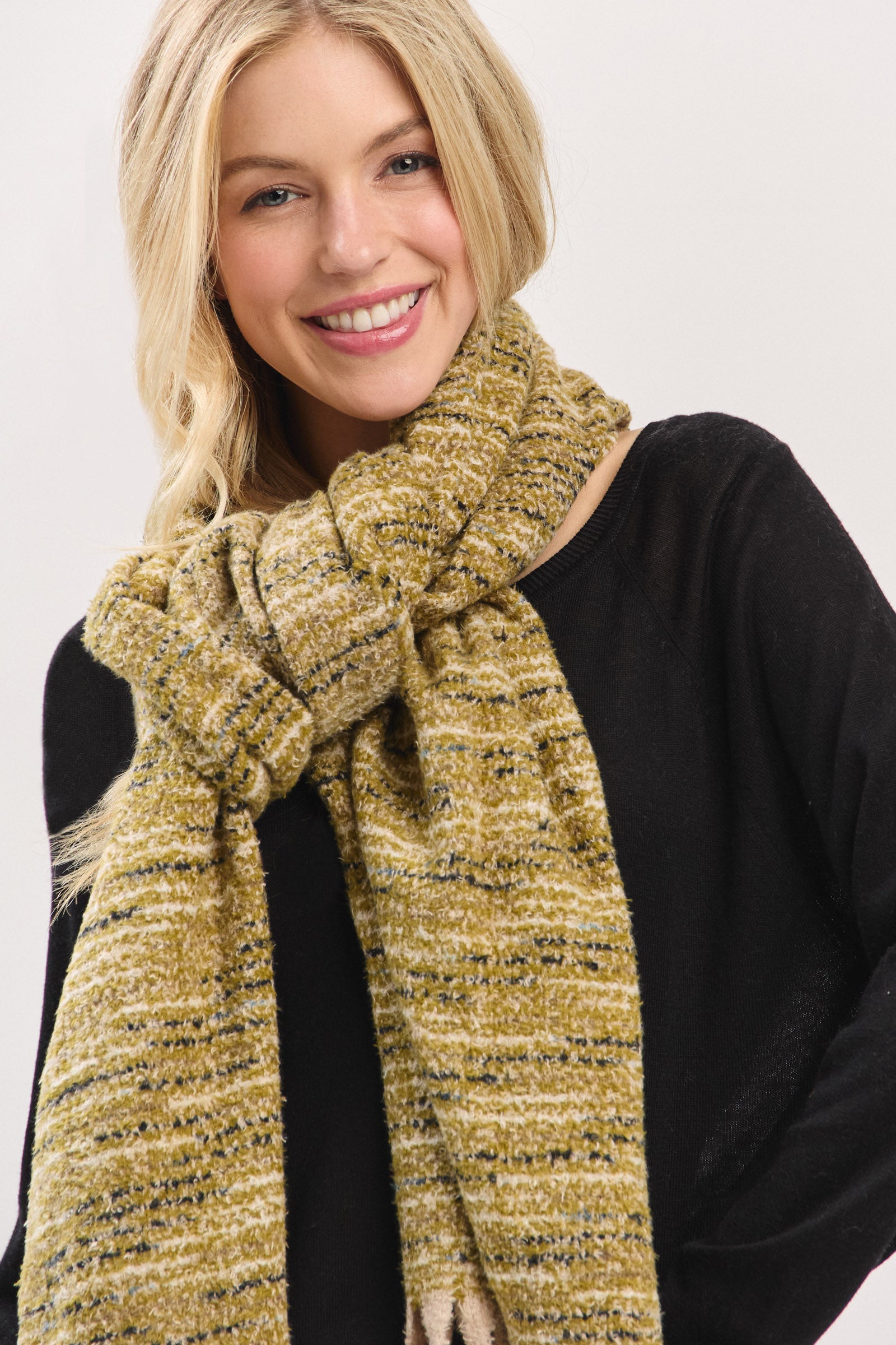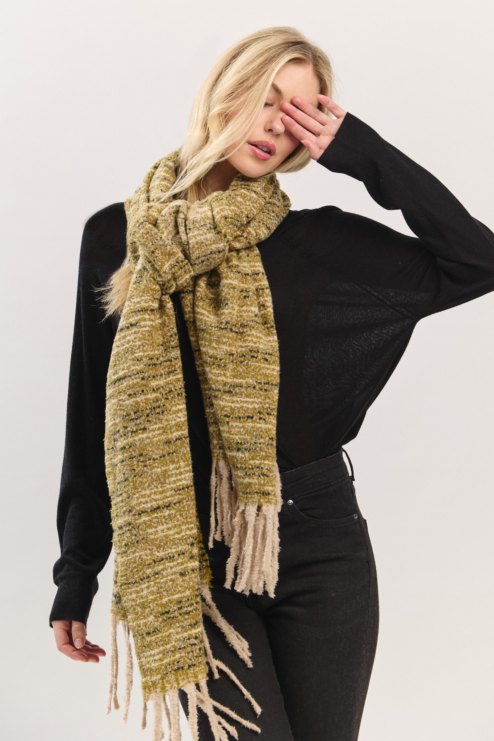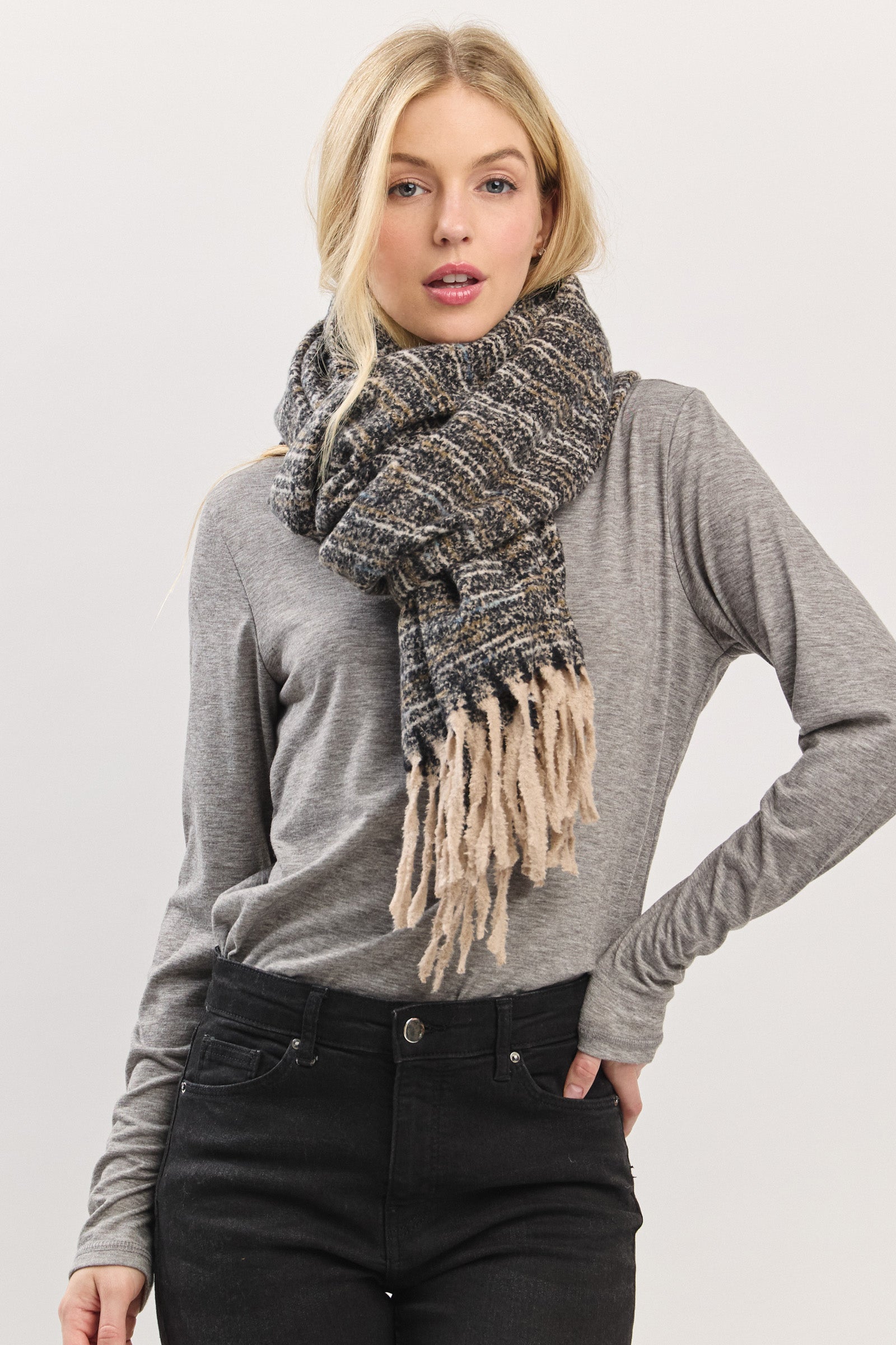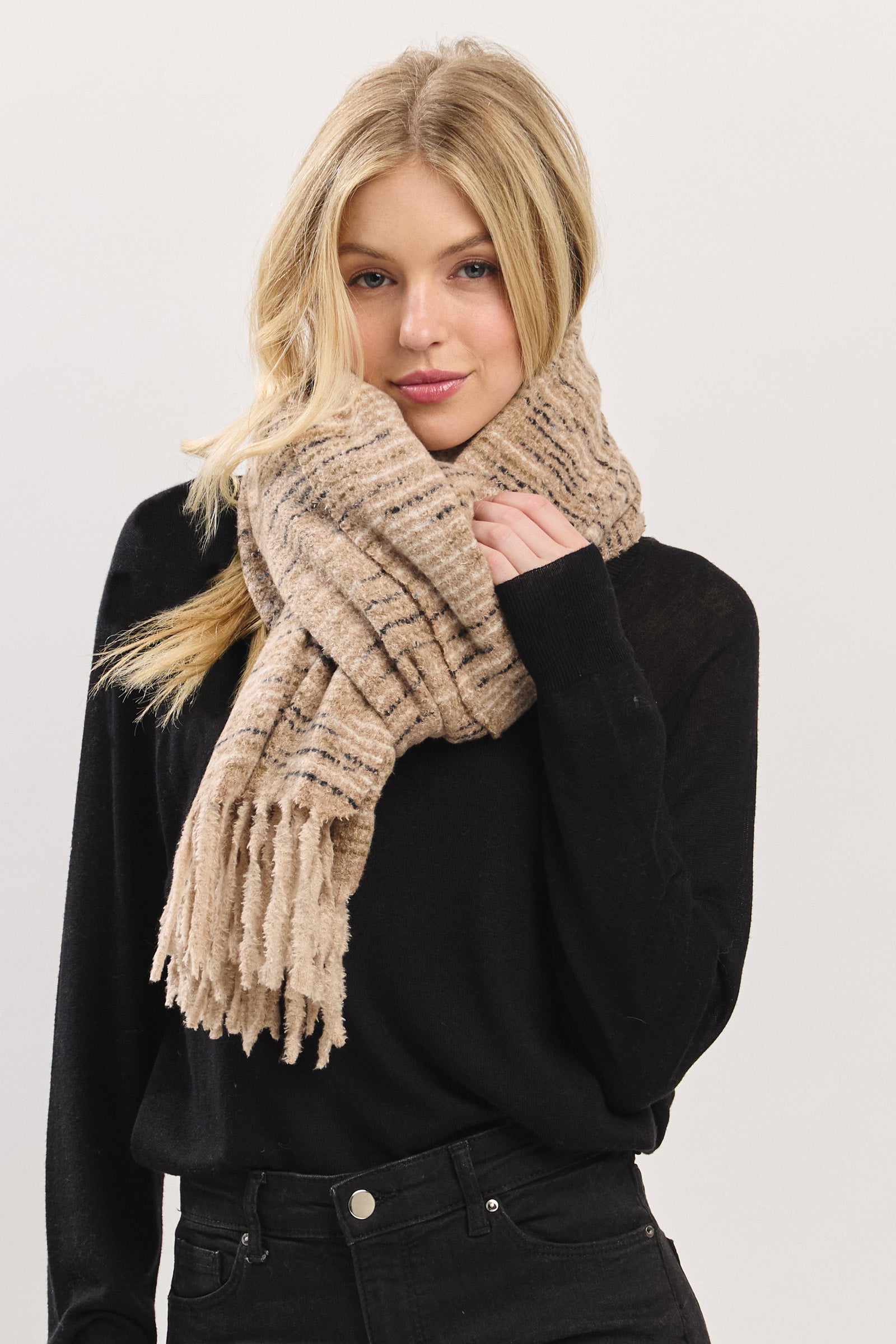 Wrap yourself in cloud-like comfort with this ultra-soft textured scarf. Designed with a plush, touchable knit and finished with playful fringe edges, it offers the perfect blend of warmth and style. Lightweight yet cozy, this scarf effortlessly drapes for a relaxed, laid-back look—ideal for chilly days or elevating everyday outfits with ease. A versatile must-have for the season.